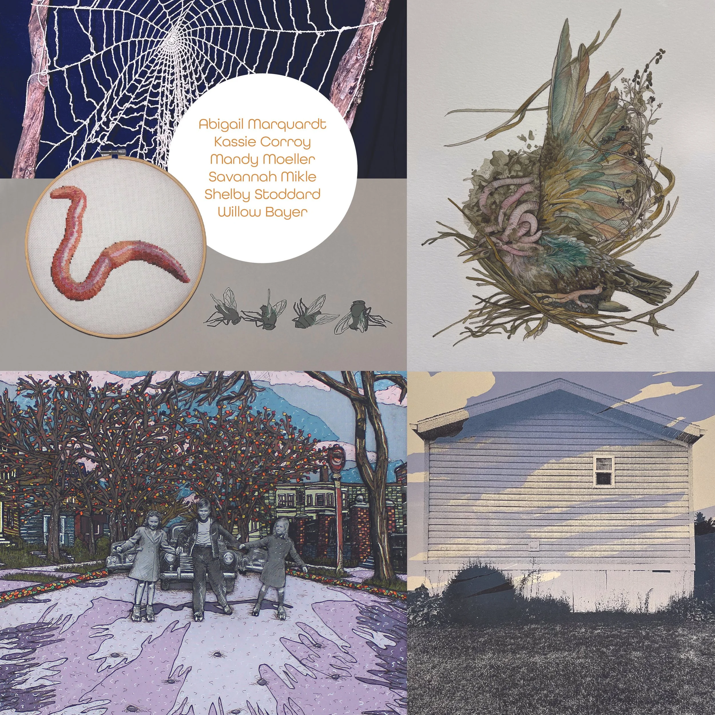Our spring exhibition features six local artists Abigail Marquardt, Kassie Corroy, Miranda Moeller, Savannah Mikle, Shelby Stoddard, and Willow Bayer. Across a variety of artistic practices from painting, collage, textiles, and print making, this group exhibition embraces the Intertwining of their works in concept and collaboration. These artists create an intertwining of art and memory, metaphor for emotion, and a reverence for the natural world.