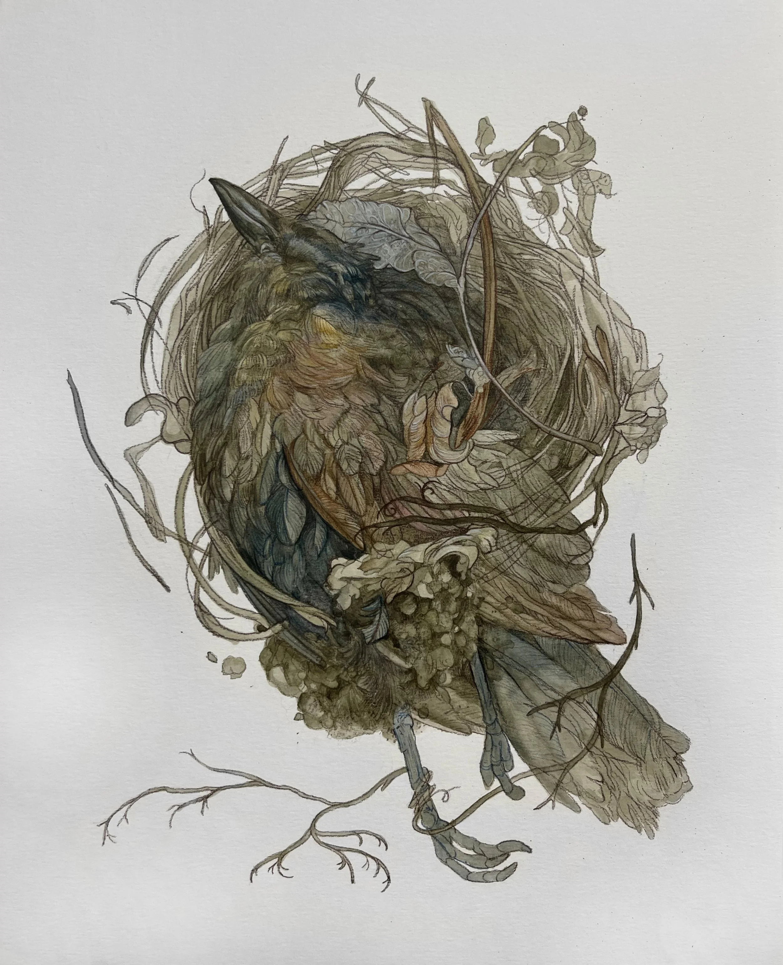 Savannah Mikle explores the cyclical essence of life and death in nature, emphasizing the resulting decomposition as flora and fauna turn back to the ground. Their paintings and drawings are self-contained moments in the process of renewal. Organic material twists and flows through the passage of time; overlapping, pushing through, undulating, never static. They value an approach in working primarily in eco-conscious materials that retain the work’s potential to break down. This includes works on unfixed paper, handmade ink from foraged materials, creative uses for material obtained from invasive species, water-based mediums, and pencil. Savannah lives and works in the Green Bay, WI area and graduated from University of Wisconsin - Green Bay with a BA in Graphic Design and Studio Arts. They appreciate access to green spaces as well as the local consciousness around conservational efforts.